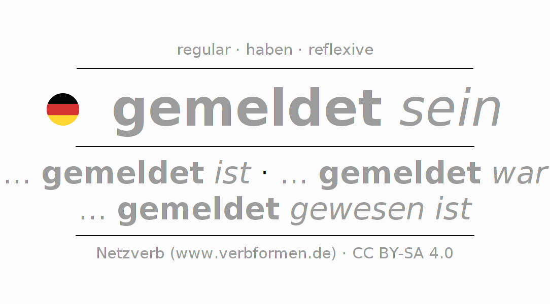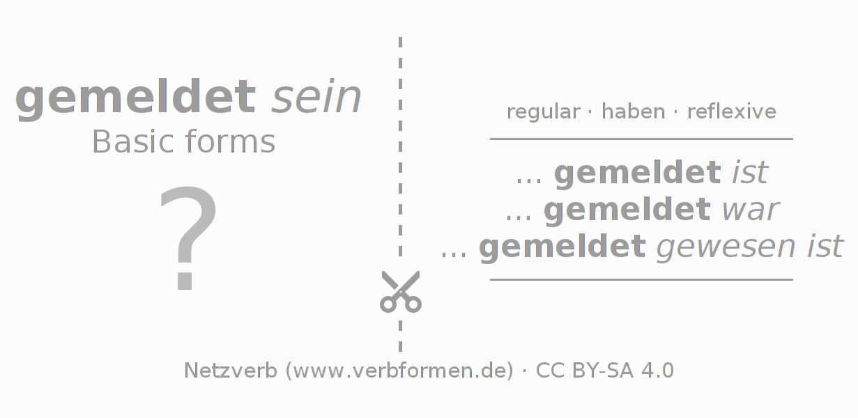 Worksheets are used generally for the conjugation of the verb melden in teaching. The materials can be used as Open Educational Resources (OER) for exercises, for games and as Tasks (CC BY-SA 4.0). There are many different types of tasks available for the verb sich melden. These are overview sheets with complete conjugation, puzzles and games that require joint learning. The entire educational material is available for free as a PDF download, as pictures and as an interactive browser version. In addition to the tasks, countless examples for melden also provide an aid to using the verb.