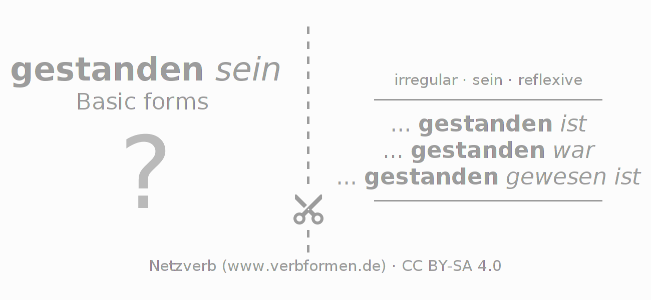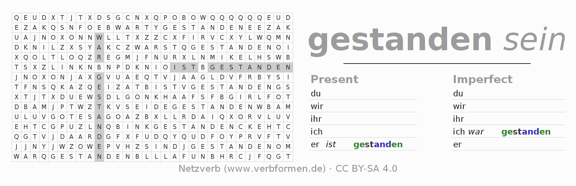 Worksheets are used generally for the conjugation of the verb stehen in teaching. The materials can be used as Open Educational Resources (OER) for exercises, for games and as Tasks (CC BY-SA 4.0). There are many different types of tasks available for the verb sich stehen (ist). These are overview sheets with complete conjugation, puzzles and games that require joint learning. The entire educational material is available for free as a PDF download, as pictures and as an interactive browser version. In addition to the tasks, countless examples for stehen also provide an aid to using the verb.