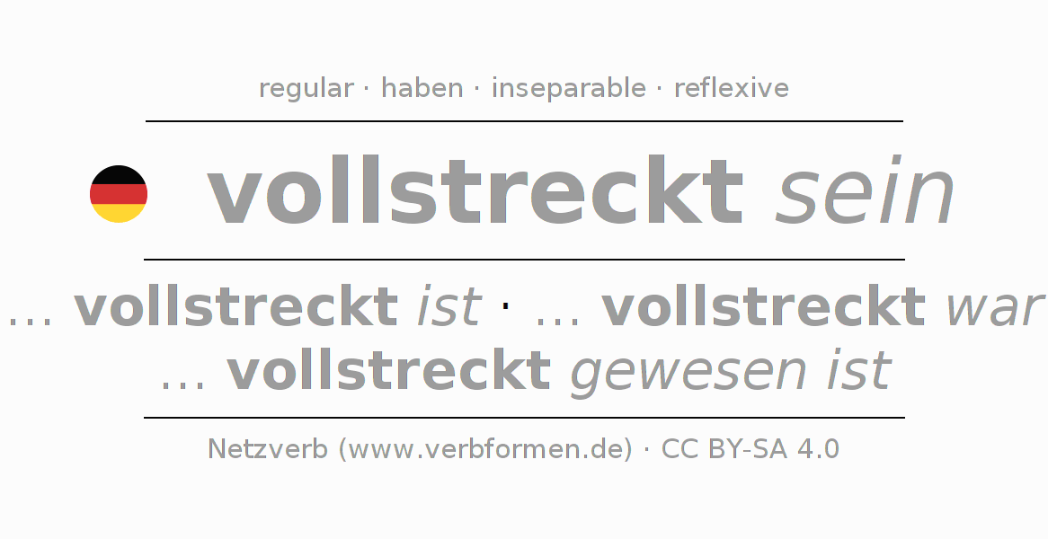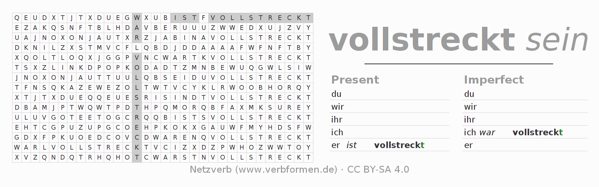 Worksheets are used generally for the conjugation of the verb vollstrecken in teaching. The materials can be used as Open Educational Resources (OER) for exercises, for games and as Tasks (CC BY-SA 4.0). There are many different types of tasks available for the verb sich vollstrecken. These are overview sheets with complete conjugation, puzzles and games that require joint learning. The entire educational material is available for free as a PDF download, as pictures and as an interactive browser version. In addition to the tasks, countless examples for vollstrecken also provide an aid to using the verb.
