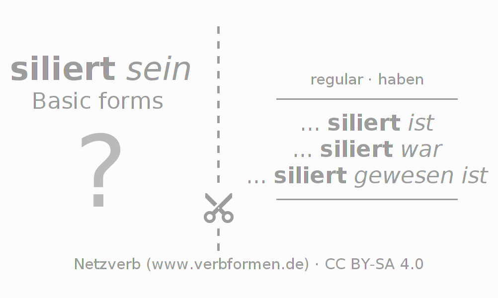 Worksheets are used generally for the conjugation of the verb silieren in teaching. The materials can be used as Open Educational Resources (OER) for exercises, for games and as Tasks (CC BY-SA 4.0). There are many different types of tasks available for the verb silieren. These are overview sheets with complete conjugation, puzzles and games that require joint learning. The entire educational material is available for free as a PDF download, as pictures and as an interactive browser version. In addition to the tasks, countless examples for silieren also provide an aid to using the verb.