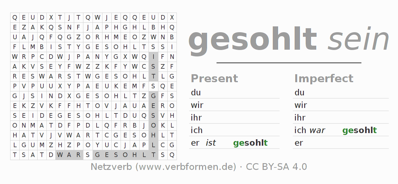 Worksheets are used generally for the conjugation of the verb sohlen in teaching. The materials can be used as Open Educational Resources (OER) for exercises, for games and as Tasks (CC BY-SA 4.0). There are many different types of tasks available for the verb sohlen. These are overview sheets with complete conjugation, puzzles and games that require joint learning. The entire educational material is available for free as a PDF download, as pictures and as an interactive browser version. In addition to the tasks, countless examples for sohlen also provide an aid to using the verb.