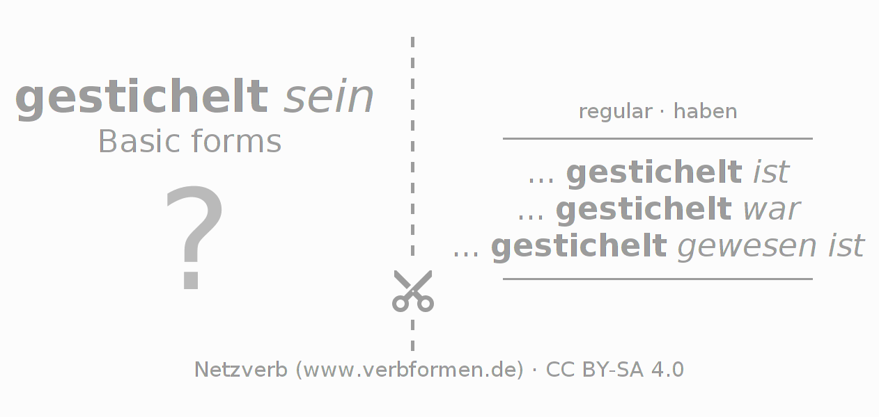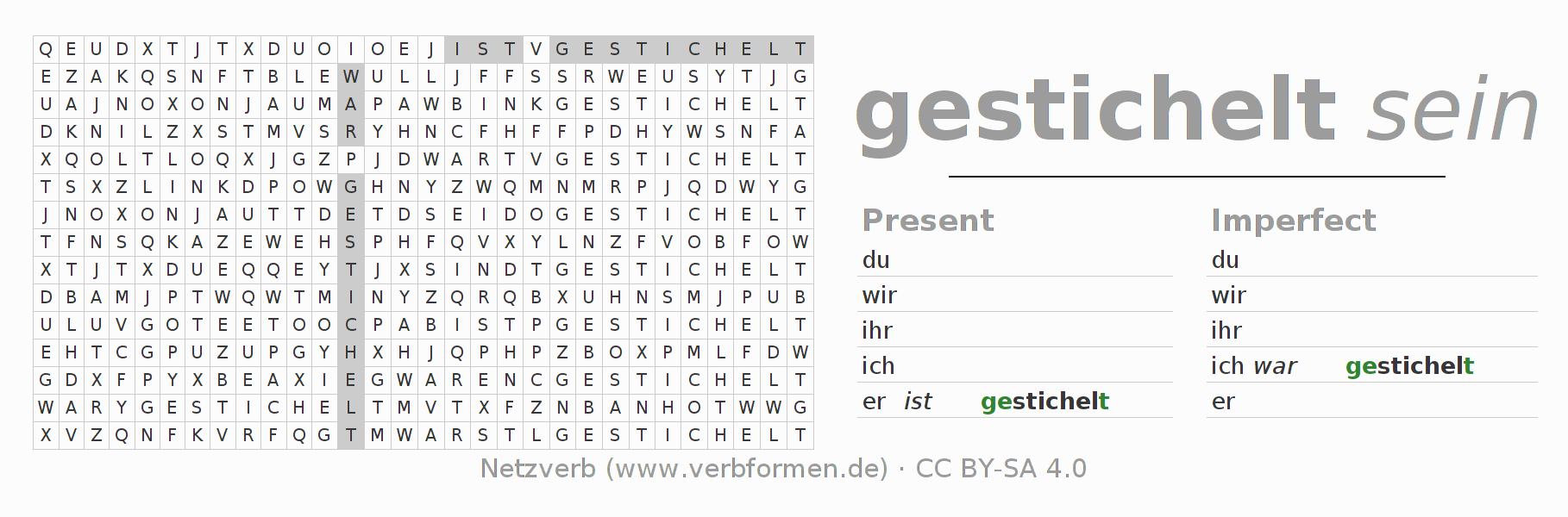 Worksheets are used generally for the conjugation of the verb sticheln in teaching. The materials can be used as Open Educational Resources (OER) for exercises, for games and as Tasks (CC BY-SA 4.0). There are many different types of tasks available for the verb sticheln. These are overview sheets with complete conjugation, puzzles and games that require joint learning. The entire educational material is available for free as a PDF download, as pictures and as an interactive browser version. In addition to the tasks, countless examples for sticheln also provide an aid to using the verb.