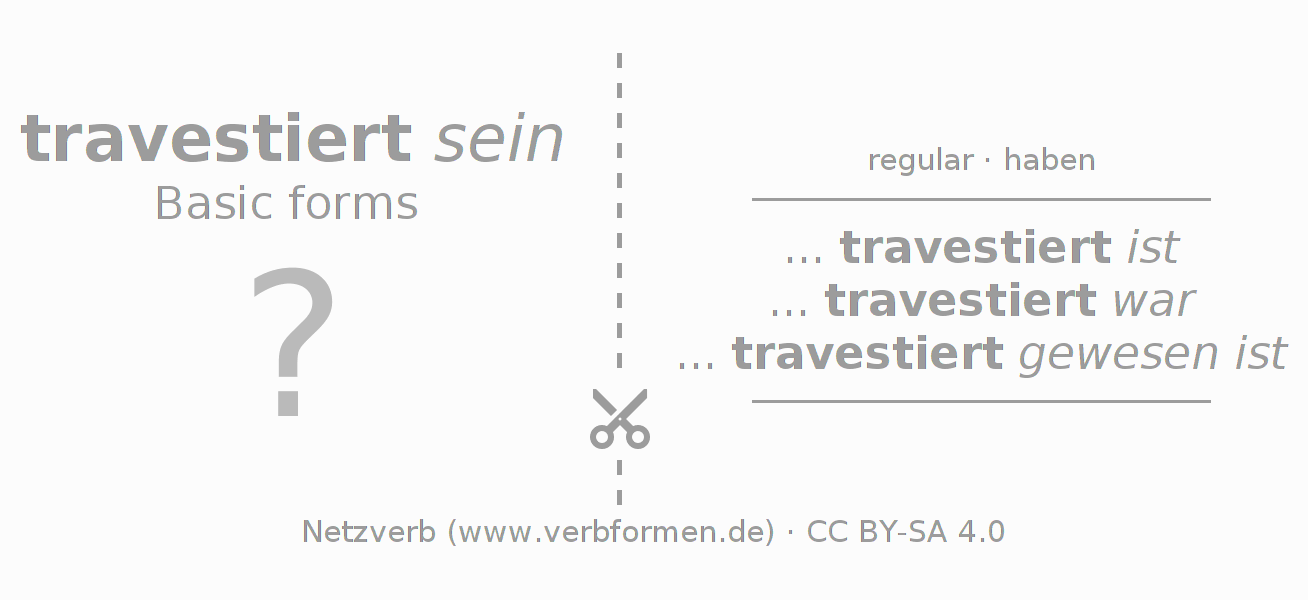 Worksheets are used generally for the conjugation of the verb travestieren in teaching. The materials can be used as Open Educational Resources (OER) for exercises, for games and as Tasks (CC BY-SA 4.0). There are many different types of tasks available for the verb travestieren. These are overview sheets with complete conjugation, puzzles and games that require joint learning. The entire educational material is available for free as a PDF download, as pictures and as an interactive browser version. In addition to the tasks, countless examples for travestieren also provide an aid to using the verb.