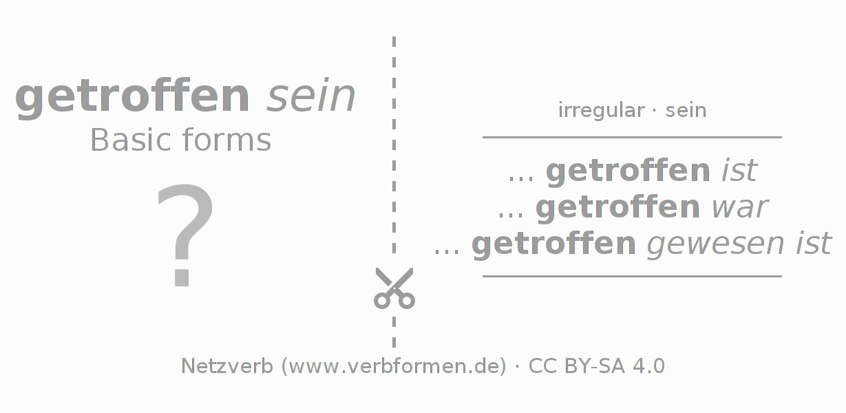 Worksheets are used generally for the conjugation of the verb treffen in teaching. The materials can be used as Open Educational Resources (OER) for exercises, for games and as Tasks (CC BY-SA 4.0). There are many different types of tasks available for the verb treffen (ist). These are overview sheets with complete conjugation, puzzles and games that require joint learning. The entire educational material is available for free as a PDF download, as pictures and as an interactive browser version. In addition to the tasks, countless examples for treffen also provide an aid to using the verb.
