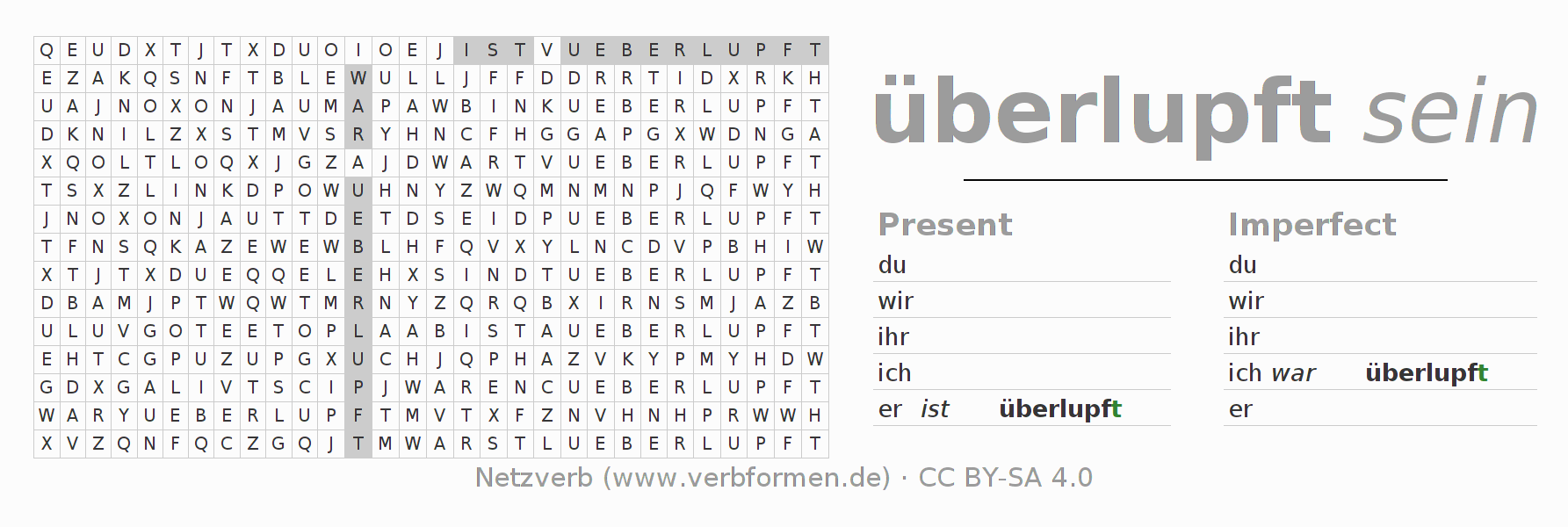 With these search word puzzles you can learn the conjugation of the German verb überlupfen.