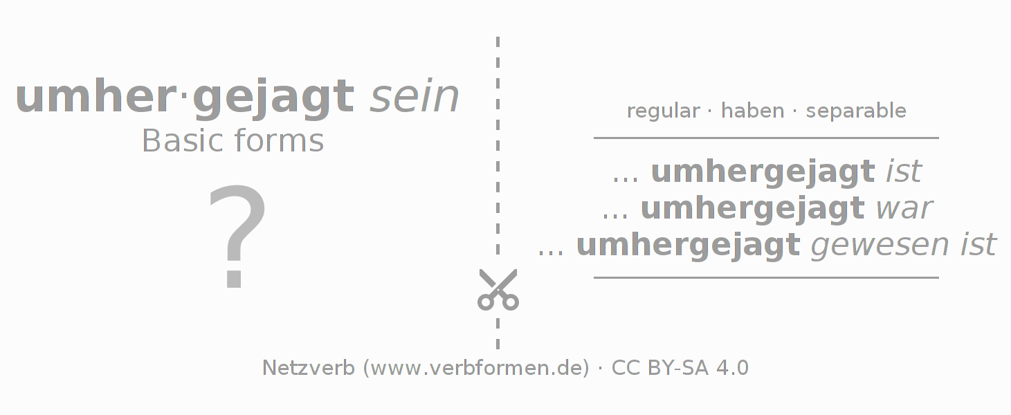 Worksheets are used generally for the conjugation of the verb umherjagen in teaching. The materials can be used as Open Educational Resources (OER) for exercises, for games and as Tasks (CC BY-SA 4.0). There are many different types of tasks available for the verb umherjagen (hat). These are overview sheets with complete conjugation, puzzles and games that require joint learning. The entire educational material is available for free as a PDF download, as pictures and as an interactive browser version. In addition to the tasks, countless examples for umherjagen also provide an aid to using the verb.
