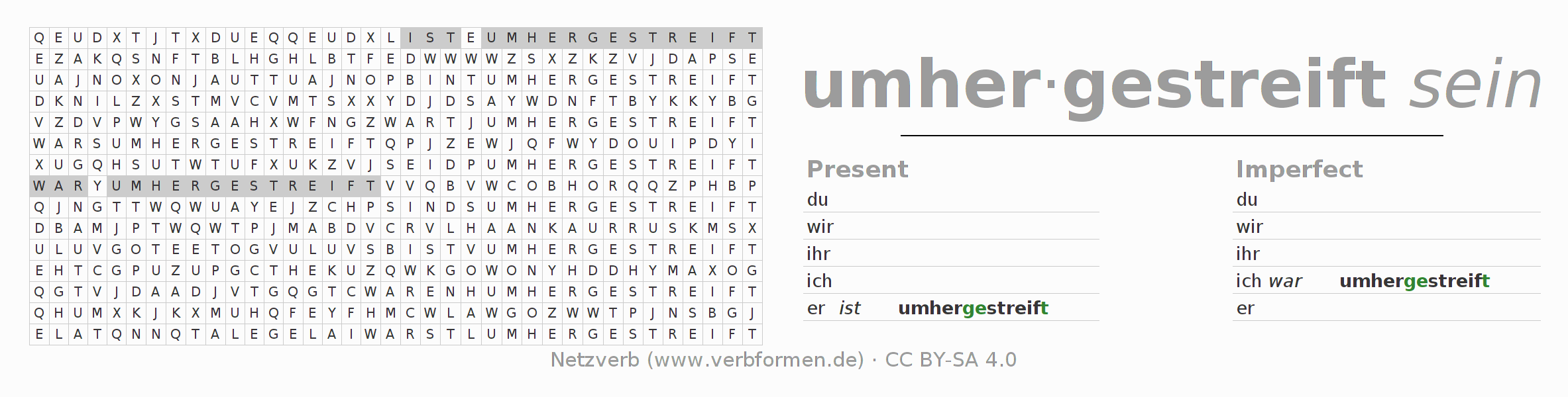 With these search word puzzles you can learn the conjugation of the German verb umherstreifen.