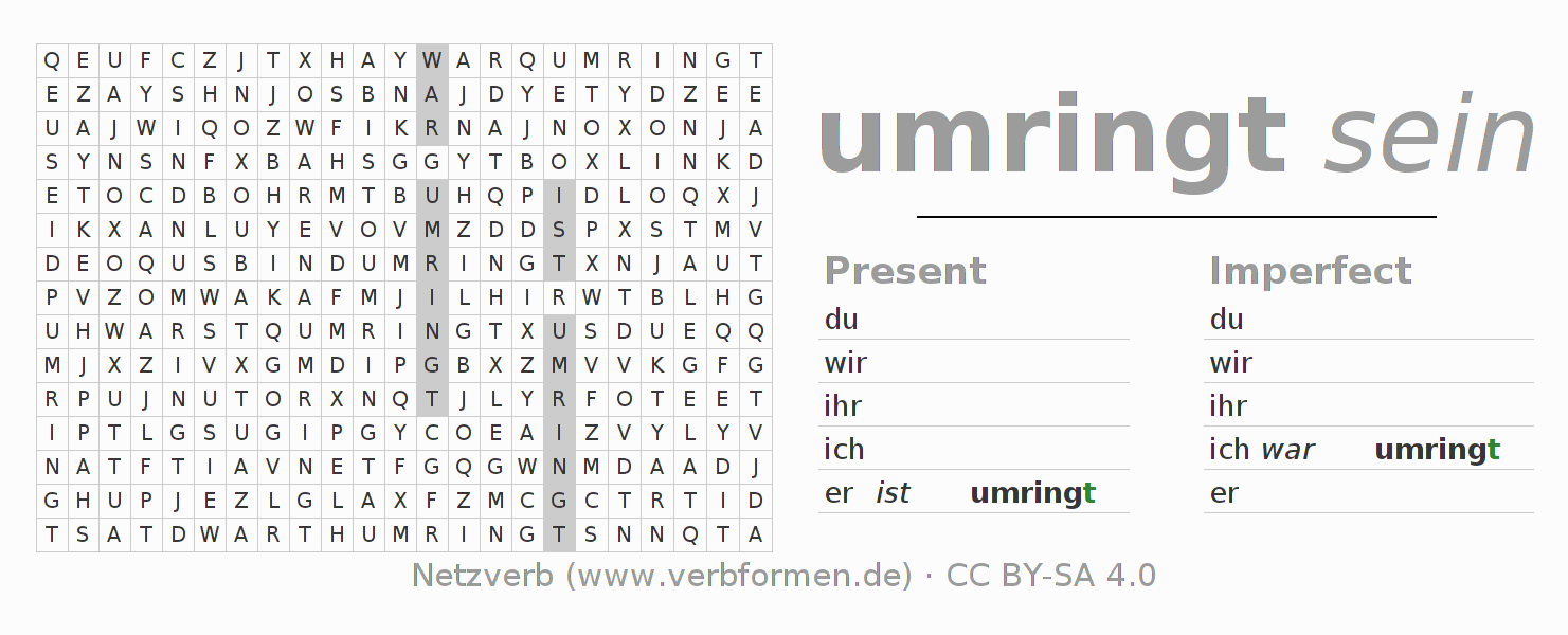 With these search word puzzles you can learn the conjugation of the German verb umringen.