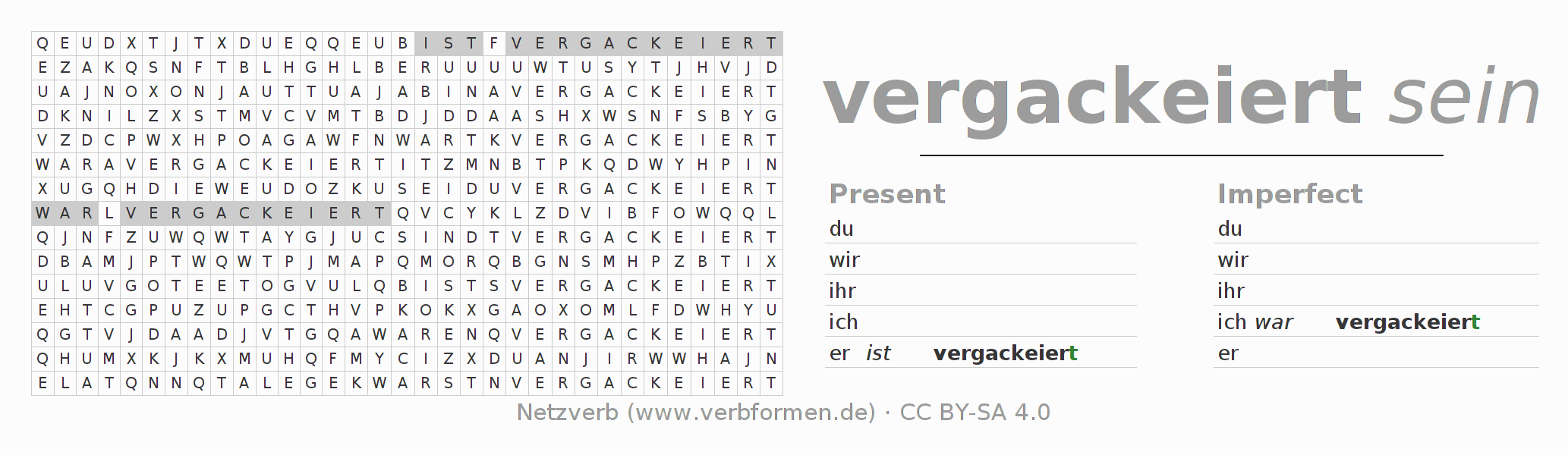 With these search word puzzles you can learn the conjugation of the German verb vergackeiern.