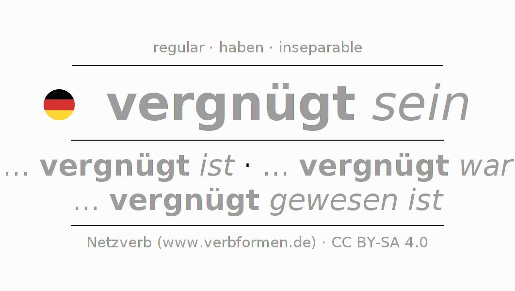 Worksheets are used generally for the conjugation of the verb vergnügen in teaching. The materials can be used as Open Educational Resources (OER) for exercises, for games and as Tasks (CC BY-SA 4.0). There are many different types of tasks available for the verb vergnügen. These are overview sheets with complete conjugation, puzzles and games that require joint learning. The entire educational material is available for free as a PDF download, as pictures and as an interactive browser version. In addition to the tasks, countless examples for vergnügen also provide an aid to using the verb.
