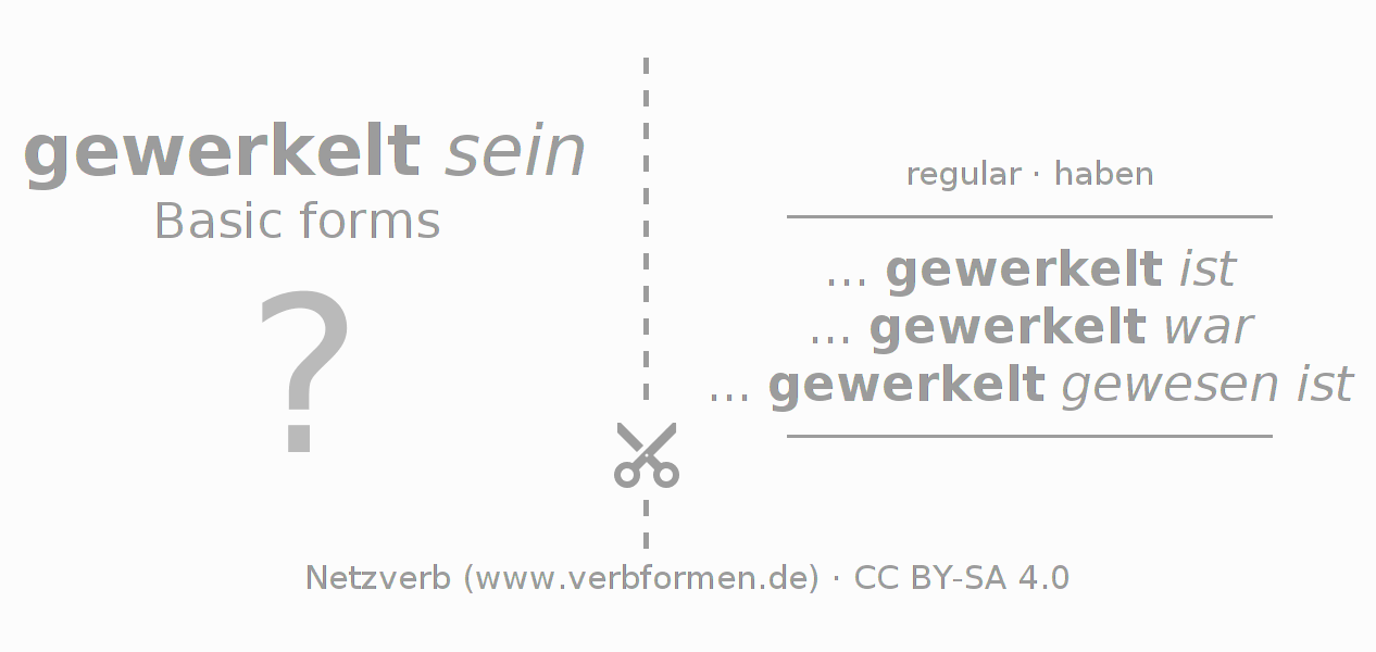 Worksheets are used generally for the conjugation of the verb werkeln in teaching. The materials can be used as Open Educational Resources (OER) for exercises, for games and as Tasks (CC BY-SA 4.0). There are many different types of tasks available for the verb werkeln. These are overview sheets with complete conjugation, puzzles and games that require joint learning. The entire educational material is available for free as a PDF download, as pictures and as an interactive browser version. In addition to the tasks, countless examples for werkeln also provide an aid to using the verb.