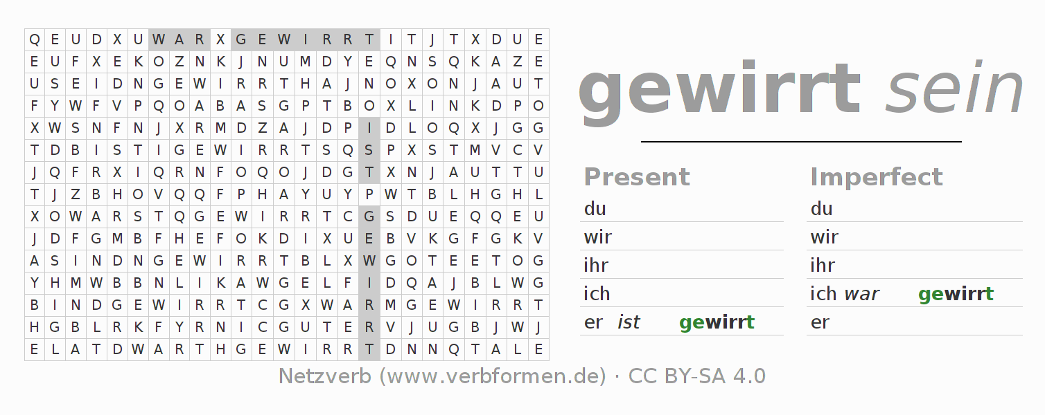 With these search word puzzles you can learn the conjugation of the German verb wirren.