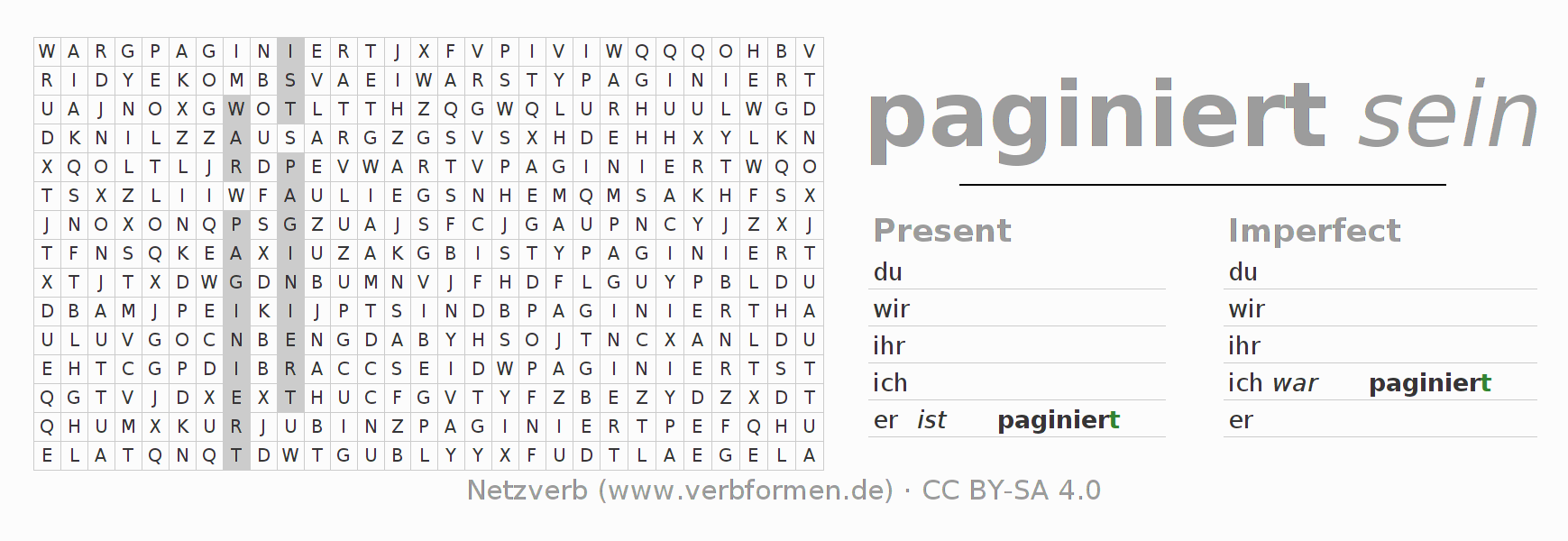 With these search word puzzles you can learn the conjugation of the German verb paginieren.