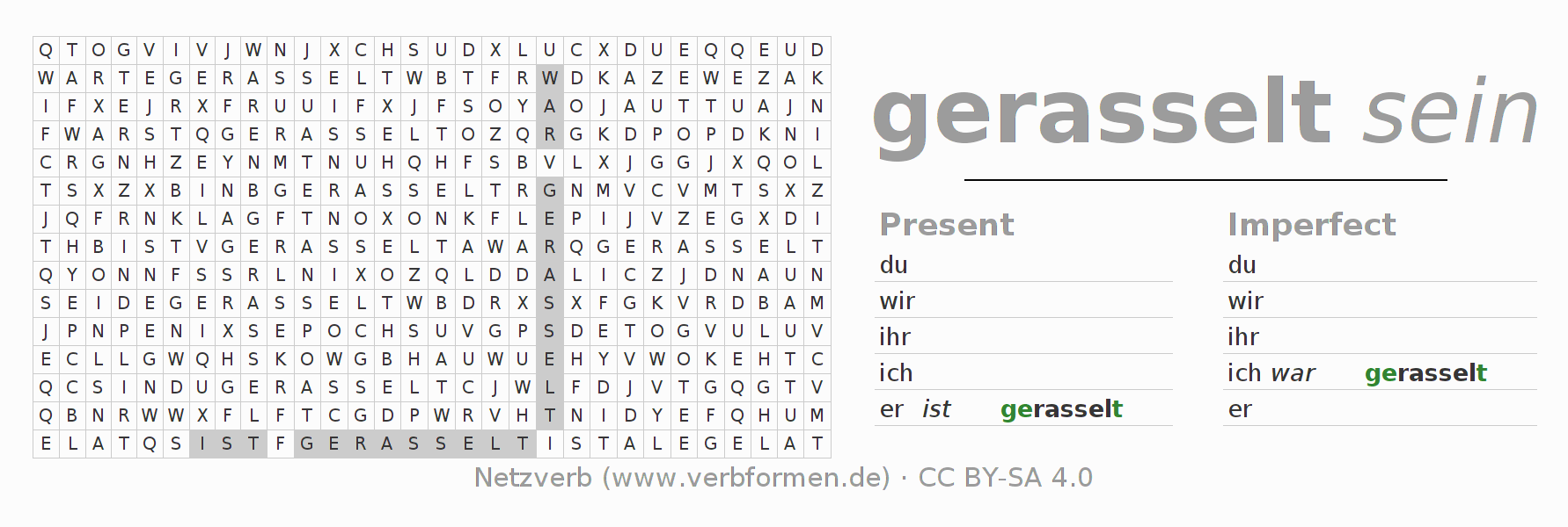 With these search word puzzles you can learn the conjugation of the German verb rasseln.