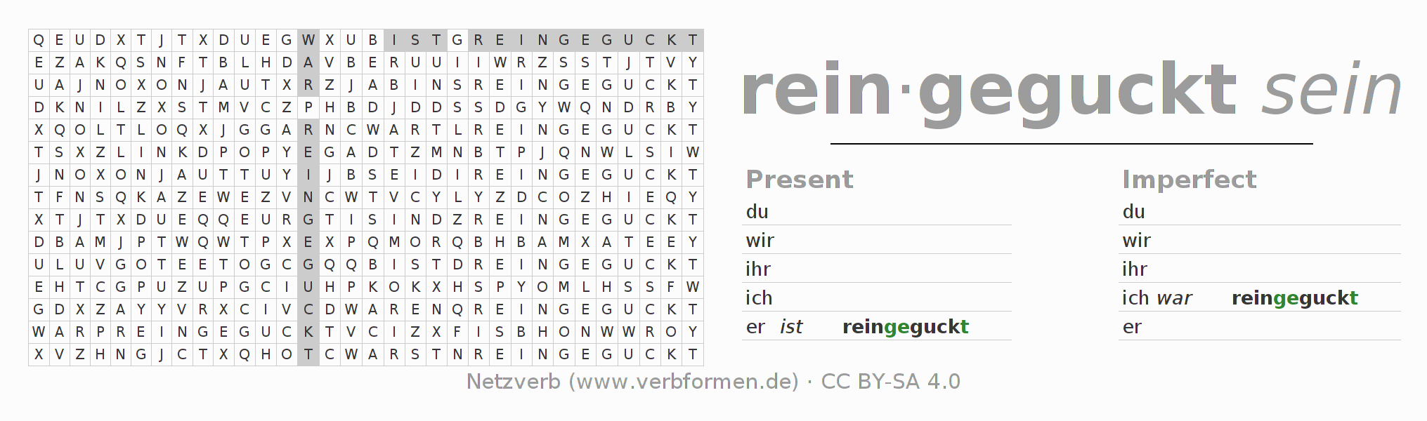 With these search word puzzles you can learn the conjugation of the German verb reingucken.