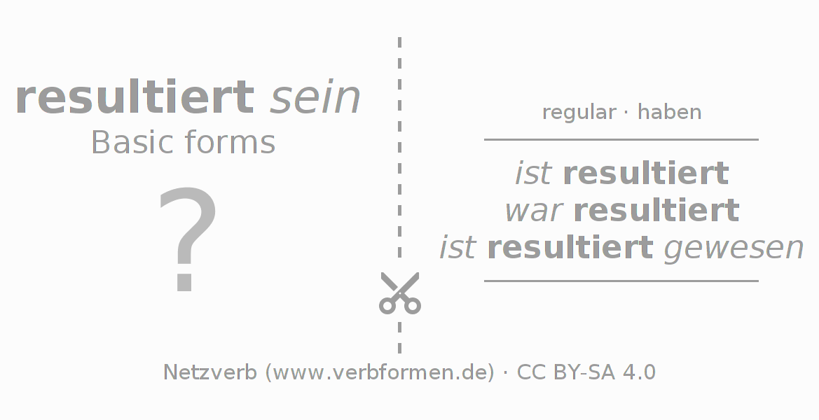 Worksheets are used generally for the conjugation of the verb resultieren in teaching. The materials can be used as Open Educational Resources (OER) for exercises, for games and as Tasks (CC BY-SA 4.0). There are many different types of tasks available for the verb resultieren. These are overview sheets with complete conjugation, puzzles and games that require joint learning. The entire educational material is available for free as a PDF download, as pictures and as an interactive browser version. In addition to the tasks, countless examples for resultieren also provide an aid to using the verb.