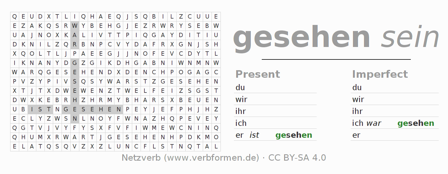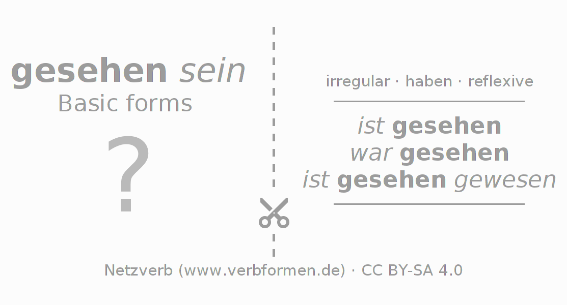 Worksheets are used generally for the conjugation of the verb sehen in teaching. The materials can be used as Open Educational Resources (OER) for exercises, for games and as Tasks (CC BY-SA 4.0). There are many different types of tasks available for the verb sich sehen. These are overview sheets with complete conjugation, puzzles and games that require joint learning. The entire educational material is available for free as a PDF download, as pictures and as an interactive browser version. In addition to the tasks, countless examples for sehen also provide an aid to using the verb.
