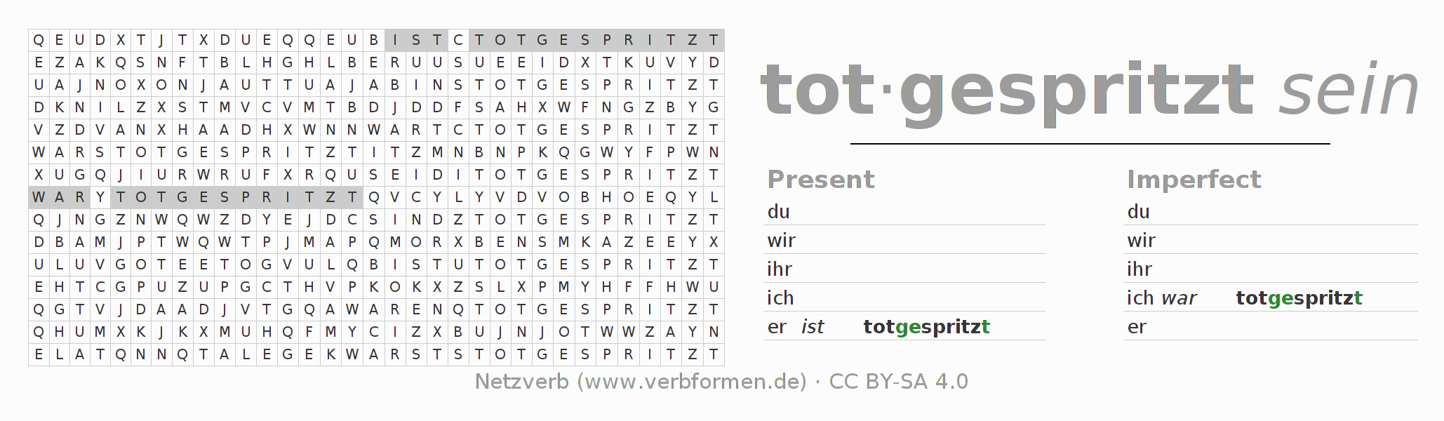 With these search word puzzles you can learn the conjugation of the German verb totspritzen.