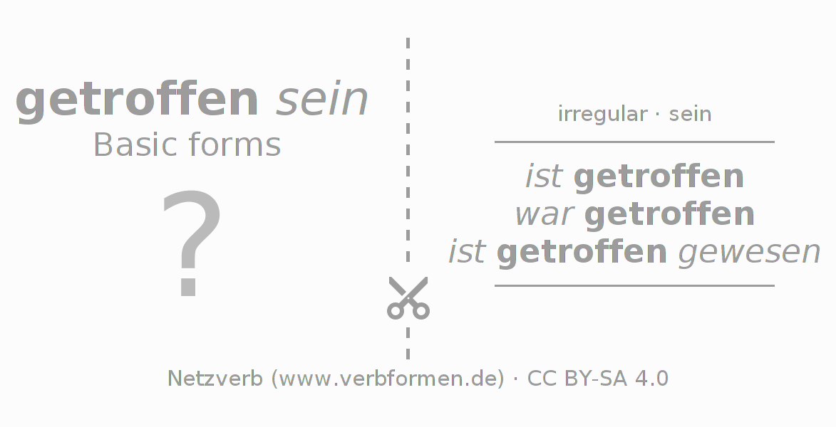 Worksheets are used generally for the conjugation of the verb treffen in teaching. The materials can be used as Open Educational Resources (OER) for exercises, for games and as Tasks (CC BY-SA 4.0). There are many different types of tasks available for the verb treffen (ist). These are overview sheets with complete conjugation, puzzles and games that require joint learning. The entire educational material is available for free as a PDF download, as pictures and as an interactive browser version. In addition to the tasks, countless examples for treffen also provide an aid to using the verb.
