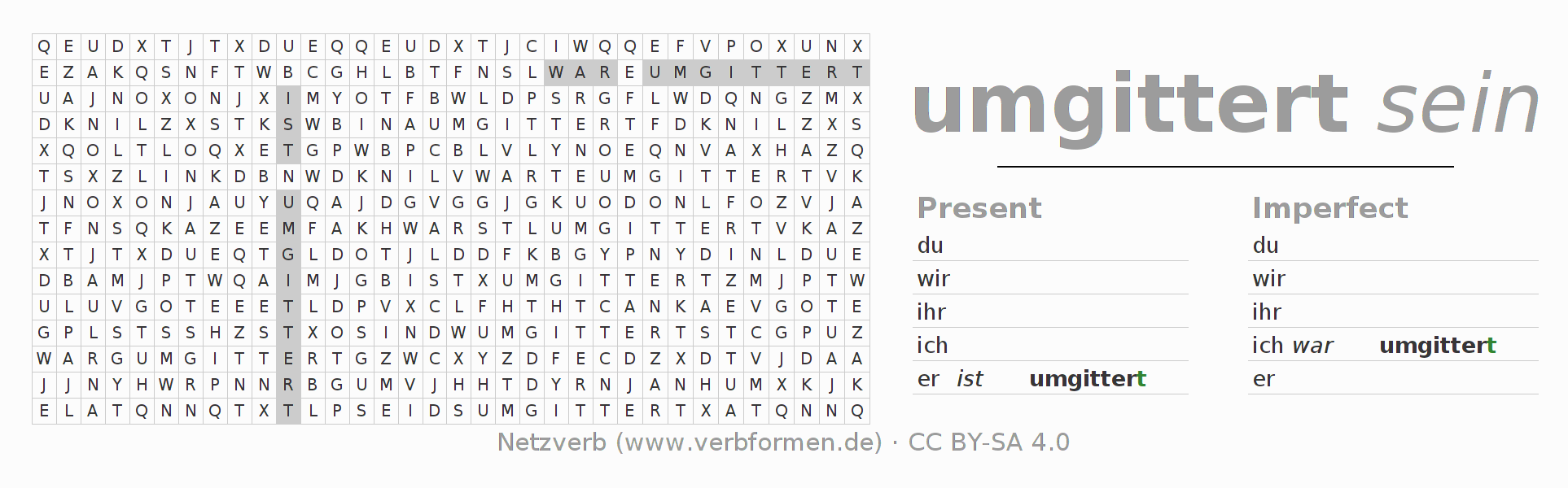 With these search word puzzles you can learn the conjugation of the German verb umgittern.