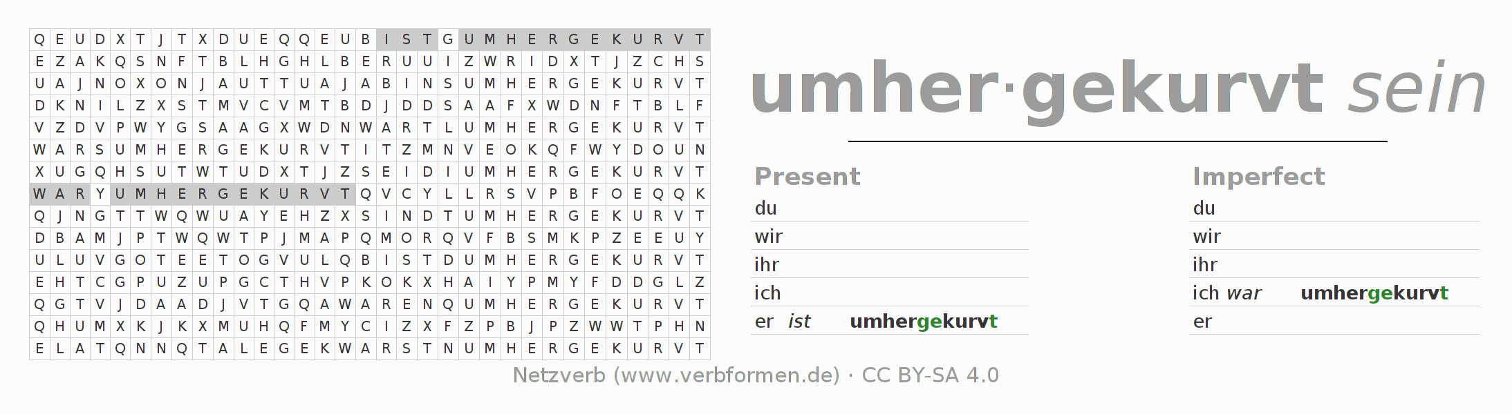 With these search word puzzles you can learn the conjugation of the German verb umherkurven.