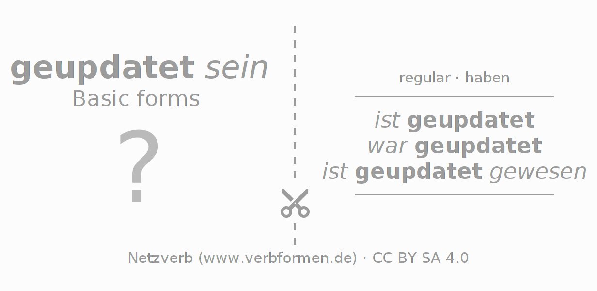 Worksheets are used generally for the conjugation of the verb updaten in teaching. The materials can be used as Open Educational Resources (OER) for exercises, for games and as Tasks (CC BY-SA 4.0). There are many different types of tasks available for the verb updaten. These are overview sheets with complete conjugation, puzzles and games that require joint learning. The entire educational material is available for free as a PDF download, as pictures and as an interactive browser version. In addition to the tasks, countless examples for updaten also provide an aid to using the verb.