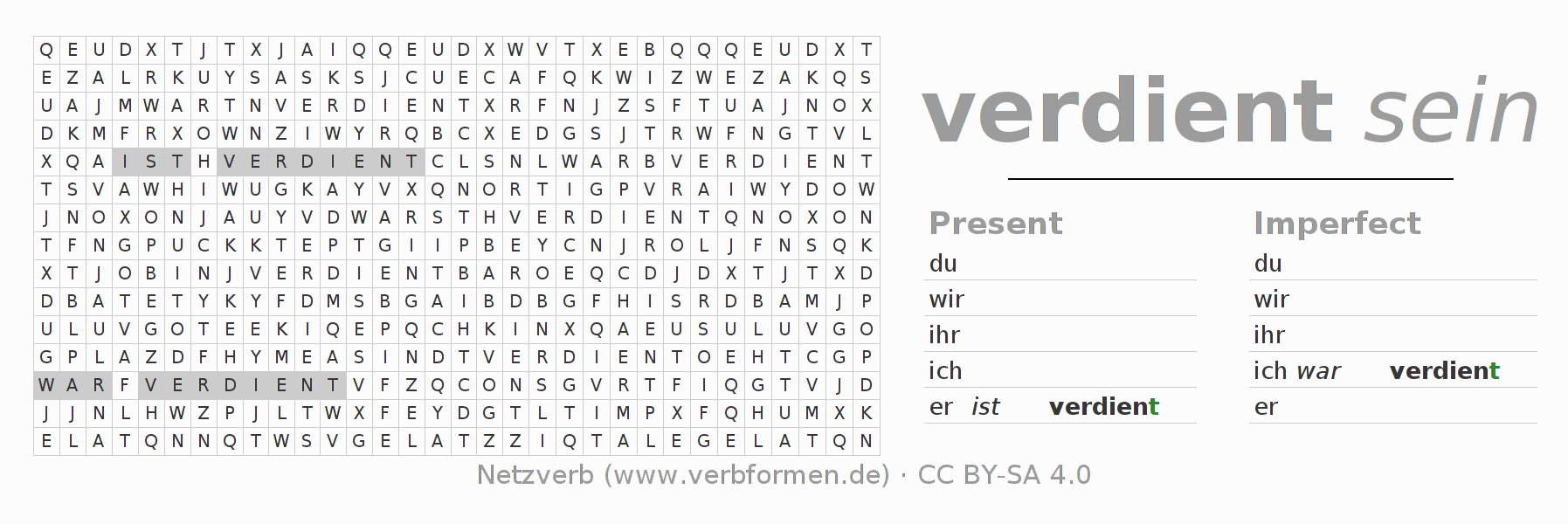 With these search word puzzles you can learn the conjugation of the German verb verdienen.
