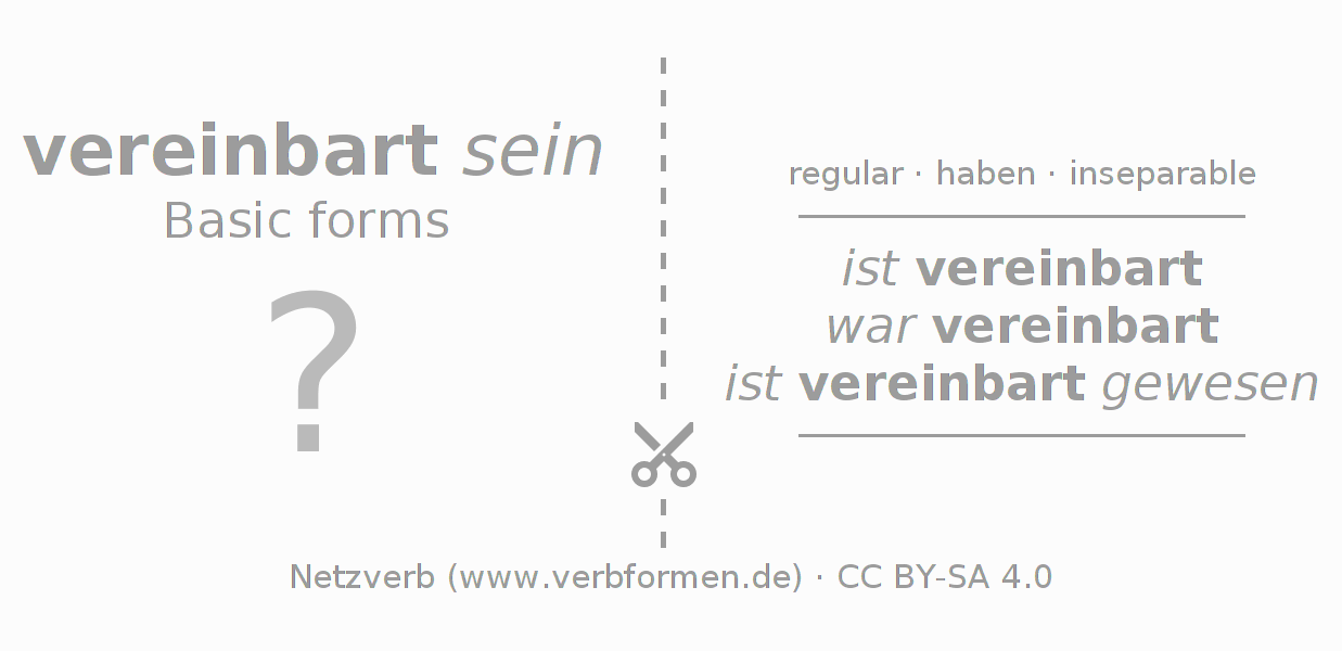 Worksheets are used generally for the conjugation of the verb vereinbaren in teaching. The materials can be used as Open Educational Resources (OER) for exercises, for games and as Tasks (CC BY-SA 4.0). There are many different types of tasks available for the verb vereinbaren. These are overview sheets with complete conjugation, puzzles and games that require joint learning. The entire educational material is available for free as a PDF download, as pictures and as an interactive browser version. In addition to the tasks, countless examples for vereinbaren also provide an aid to using the verb.