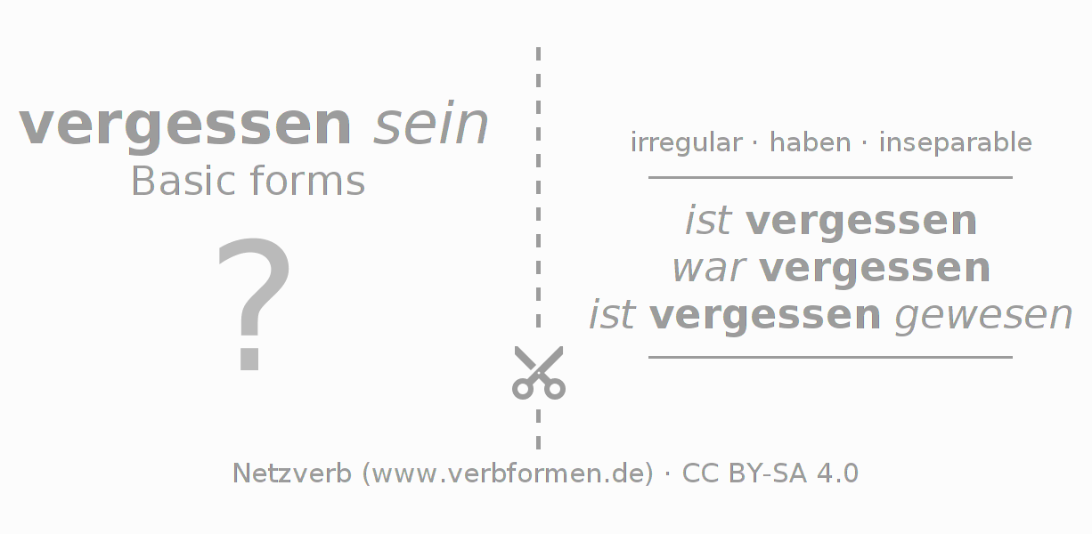Worksheets are used generally for the conjugation of the verb vergessen in teaching. The materials can be used as Open Educational Resources (OER) for exercises, for games and as Tasks (CC BY-SA 4.0). There are many different types of tasks available for the verb vergessen. These are overview sheets with complete conjugation, puzzles and games that require joint learning. The entire educational material is available for free as a PDF download, as pictures and as an interactive browser version. In addition to the tasks, countless examples for vergessen also provide an aid to using the verb.