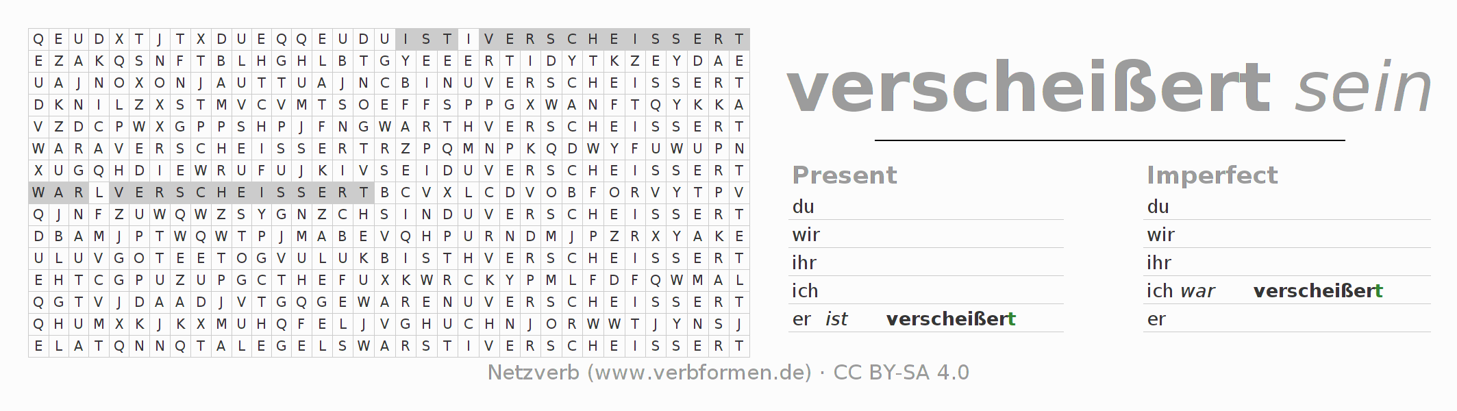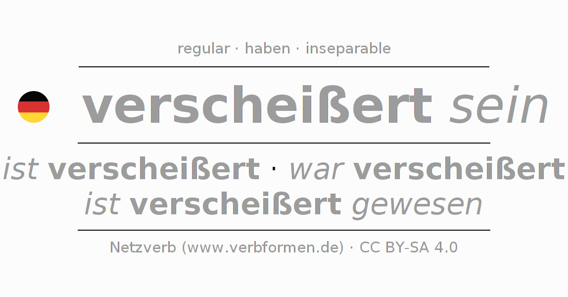 Worksheets are used generally for the conjugation of the verb verscheißern in teaching. The materials can be used as Open Educational Resources (OER) for exercises, for games and as Tasks (CC BY-SA 4.0). There are many different types of tasks available for the verb verscheißern. These are overview sheets with complete conjugation, puzzles and games that require joint learning. The entire educational material is available for free as a PDF download, as pictures and as an interactive browser version. In addition to the tasks, countless examples for verscheißern also provide an aid to using the verb.