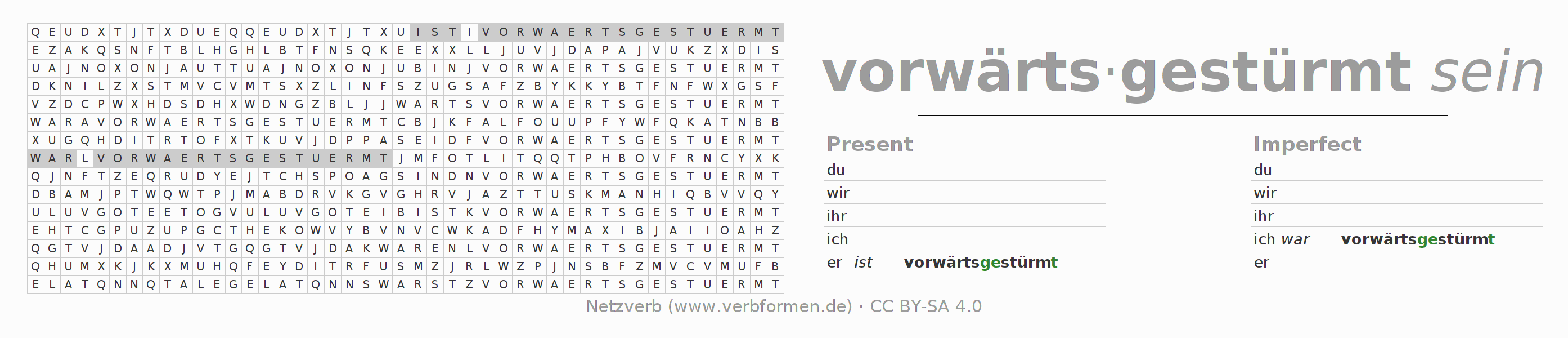 With these search word puzzles you can learn the conjugation of the German verb vorwärtsstürmen.
