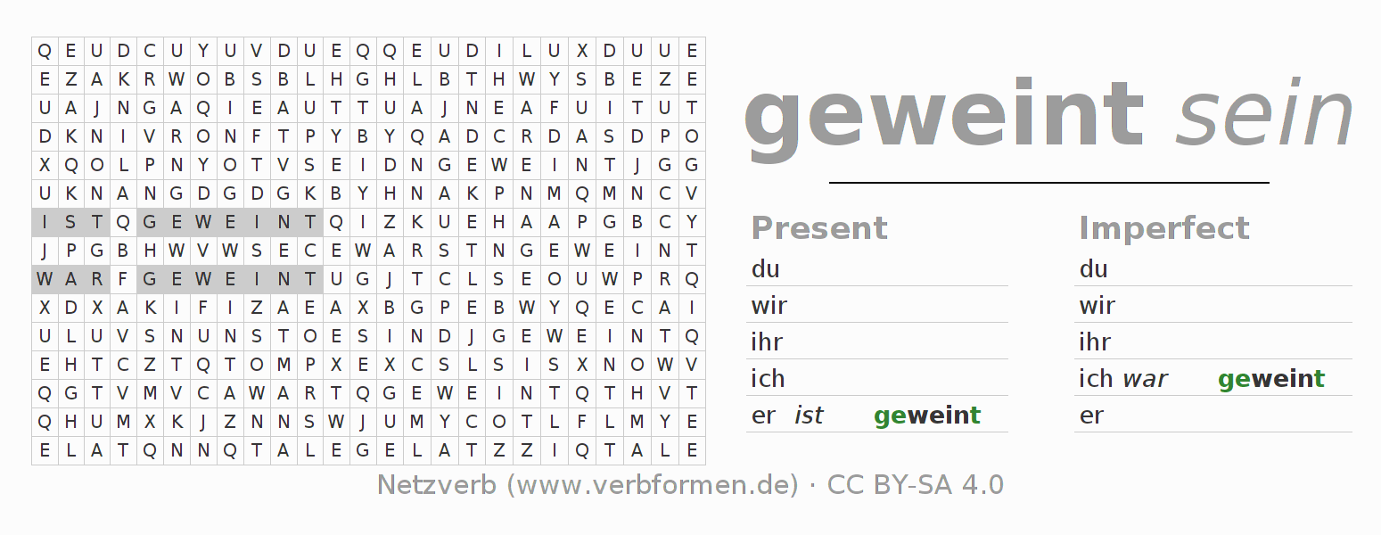 With these search word puzzles you can learn the conjugation of the German verb weinen.