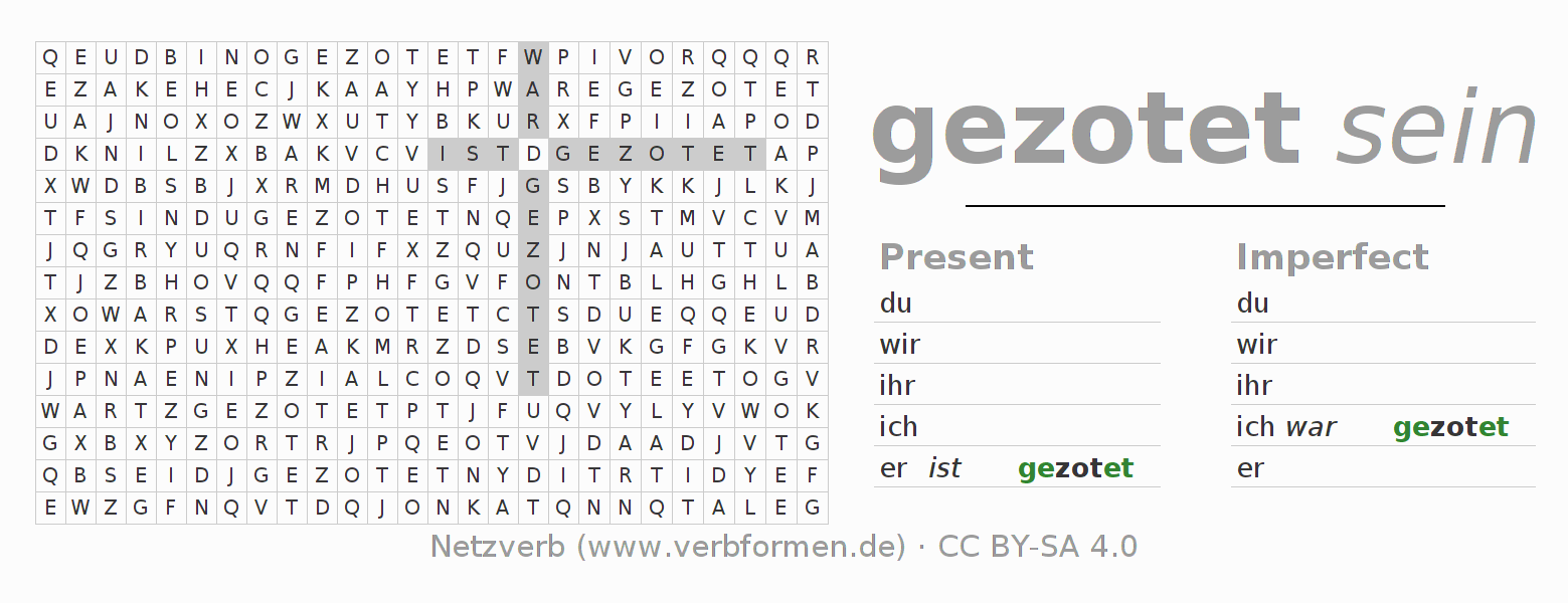 With these search word puzzles you can learn the conjugation of the German verb zoten.