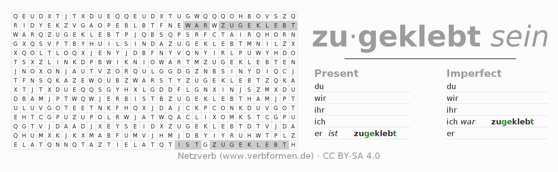 With these search word puzzles you can learn the conjugation of the German verb zukleben.