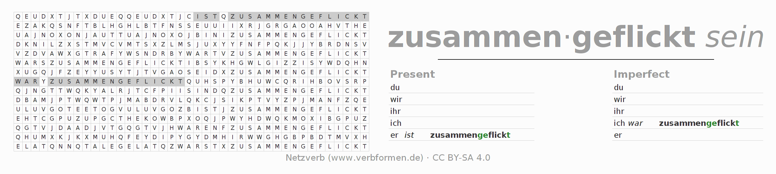 With these search word puzzles you can learn the conjugation of the German verb zusammenflicken.