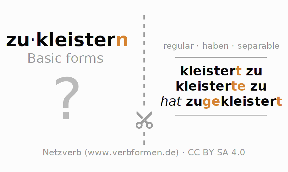 Worksheets are used generally for the conjugation of the verb zukleistern in teaching. The materials can be used as Open Educational Resources (OER) for exercises, for games and as Tasks (CC BY-SA 4.0). There are many different types of tasks available for the verb zukleistern. These are overview sheets with complete conjugation, puzzles and games that require joint learning. The entire educational material is available for free as a PDF download, as pictures and as an interactive browser version. In addition to the tasks, countless examples for zukleistern also provide an aid to using the verb.