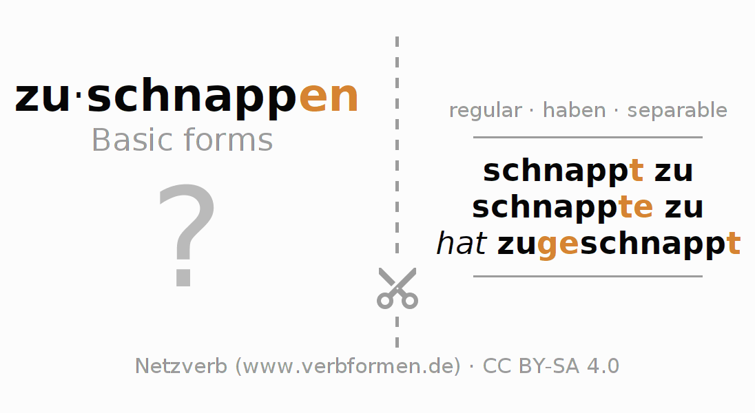 Worksheets are used generally for the conjugation of the verb zuschnappen in teaching. The materials can be used as Open Educational Resources (OER) for exercises, for games and as Tasks (CC BY-SA 4.0). There are many different types of tasks available for the verb zuschnappen (hat). These are overview sheets with complete conjugation, puzzles and games that require joint learning. The entire educational material is available for free as a PDF download, as pictures and as an interactive browser version. In addition to the tasks, countless examples for zuschnappen also provide an aid to using the verb.