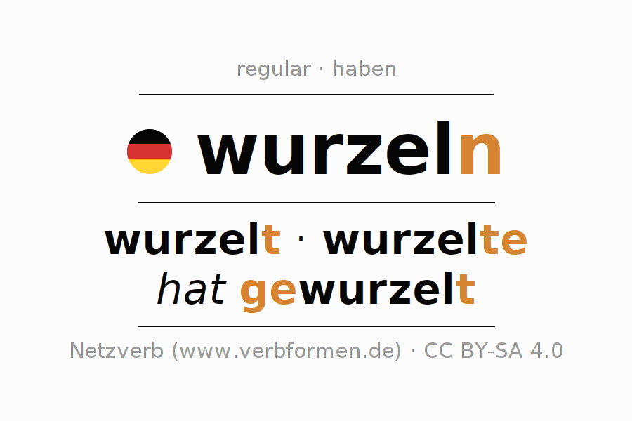 Clear online presentation of the verb 'wurzeln' including all verb forms. Therfore, the flection of the verb wurzeln can be useful for homework, tests, exams, German lessons in school, learning German, during studies and adult education. Especially for people learning German it is essential to know the correct flection of a verb (wurzelt - wurzelte - hat gewurzelt).