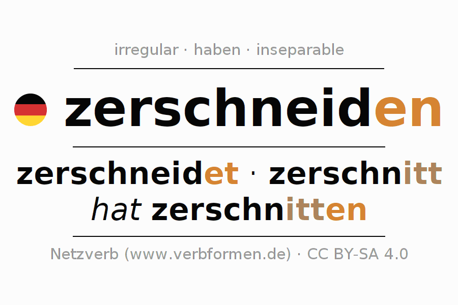 Clear online presentation of the verb 'zerschneiden' including all verb forms. Therfore, the flection of the verb zerschneiden can be useful for homework, tests, exams, German lessons in school, learning German, during studies and adult education. Especially for people learning German it is essential to know the correct flection of a verb (zerschneidet - zerschnitt - hat zerschnitten).