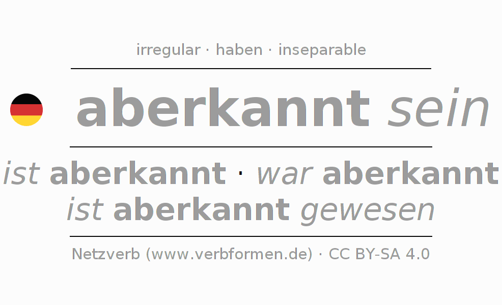 Clear online presentation of the verb 'aberkannt sein' including all verb forms. Therfore, the flection of the verb aberkannt sein can be useful for homework, tests, exams, German lessons in school, learning German, during studies and adult education. Especially for people learning German it is essential to know the correct flection of a verb (ist aberkannt - war aberkannt - ist aberkannt gewesen).