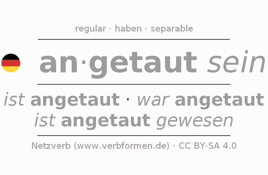 Clear online presentation of the verb 'an·getaut sein' including all verb forms. Therfore, the flection of the verb an·getaut sein can be useful for homework, tests, exams, German lessons in school, learning German, during studies and adult education. Especially for people learning German it is essential to know the correct flection of a verb (ist angetaut - war angetaut - ist angetaut gewesen).