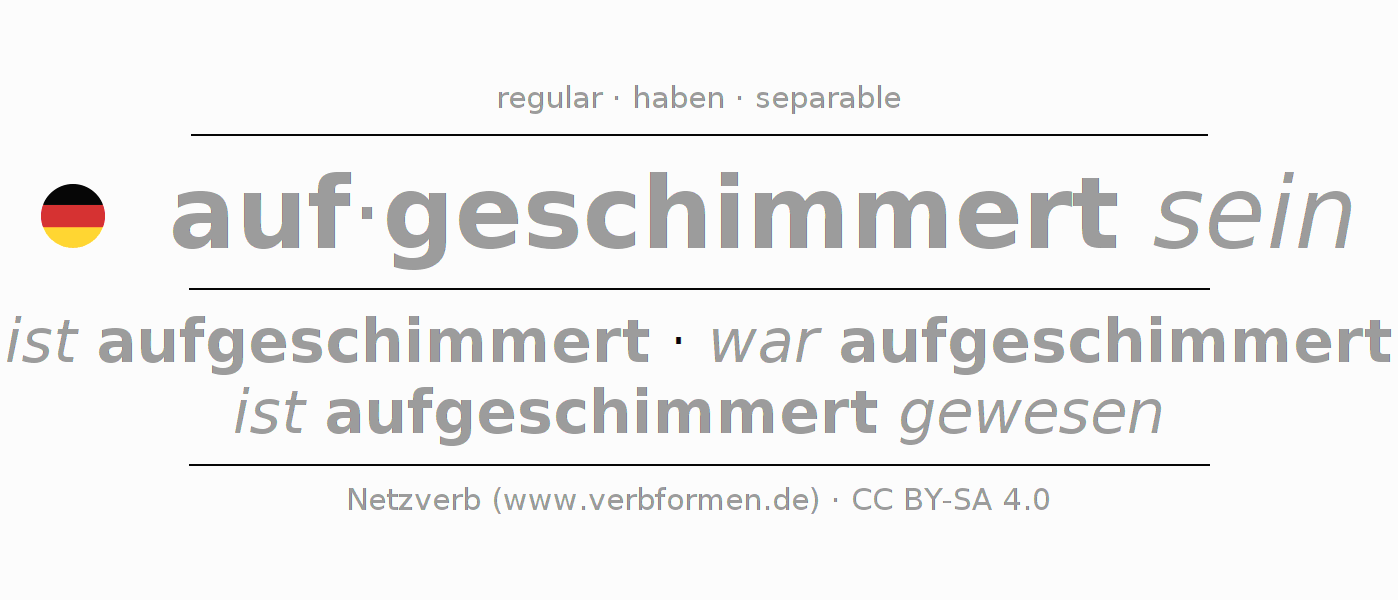 - Future Perfect: ich werde aufgeschimmert gewesen sein, du werdest aufgeschimmert gewesen sein, er werde aufgeschimmert gewesen sein, wir werden aufgeschimmert gewesen sein, ihr werdet aufgeschimmert gewesen sein, sie werden aufgeschimmert gewesen sein