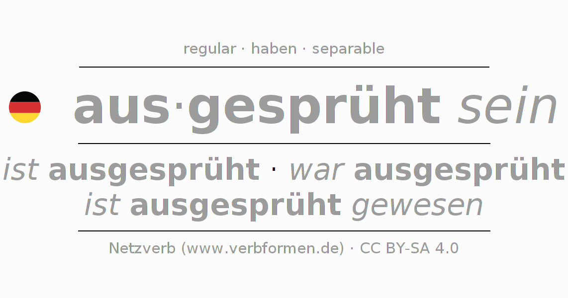 Clear online presentation of the verb 'aus·gesprüht sein' including all verb forms. Therfore, the flection of the verb aus·gesprüht sein can be useful for homework, tests, exams, German lessons in school, learning German, during studies and adult education. Especially for people learning German it is essential to know the correct flection of a verb (ist ausgesprüht - war ausgesprüht - ist ausgesprüht gewesen).