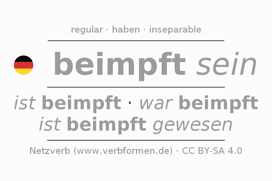 Clear online presentation of the verb 'beimpft sein' including all verb forms. Therfore, the flection of the verb beimpft sein can be useful for homework, tests, exams, German lessons in school, learning German, during studies and adult education. Especially for people learning German it is essential to know the correct flection of a verb (ist beimpft - war beimpft - ist beimpft gewesen).