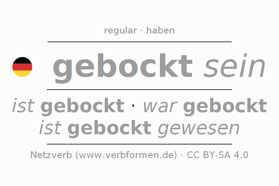 - Future Perfect: ich werde gebockt gewesen sein, du wirst gebockt gewesen sein, er wird gebockt gewesen sein, wir werden gebockt gewesen sein, ihr werdet gebockt gewesen sein, sie werden gebockt gewesen sein