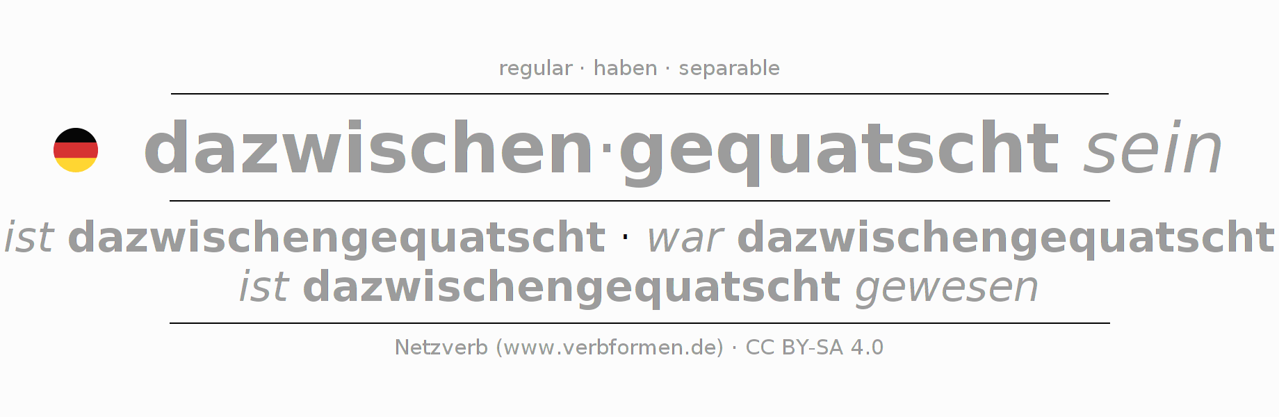 - Present: ich bin dazwischengequatscht, du bist dazwischengequatscht, er ist dazwischengequatscht, wir sind dazwischengequatscht, ihr seid dazwischengequatscht, sie sind dazwischengequatscht