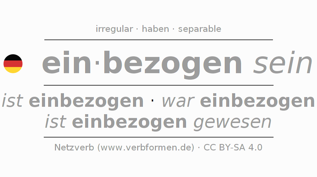 - Present: ich bin einbezogen, du bist einbezogen, er ist einbezogen, wir sind einbezogen, ihr seid einbezogen, sie sind einbezogen