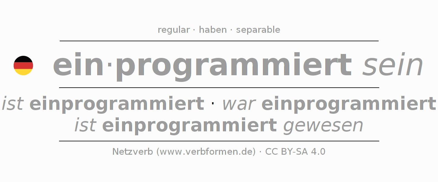 Clear online presentation of the verb 'ein·programmiert sein' including all verb forms. Therfore, the flection of the verb ein·programmiert sein can be useful for homework, tests, exams, German lessons in school, learning German, during studies and adult education. Especially for people learning German it is essential to know the correct flection of a verb (ist einprogrammiert - war einprogrammiert - ist einprogrammiert gewesen).