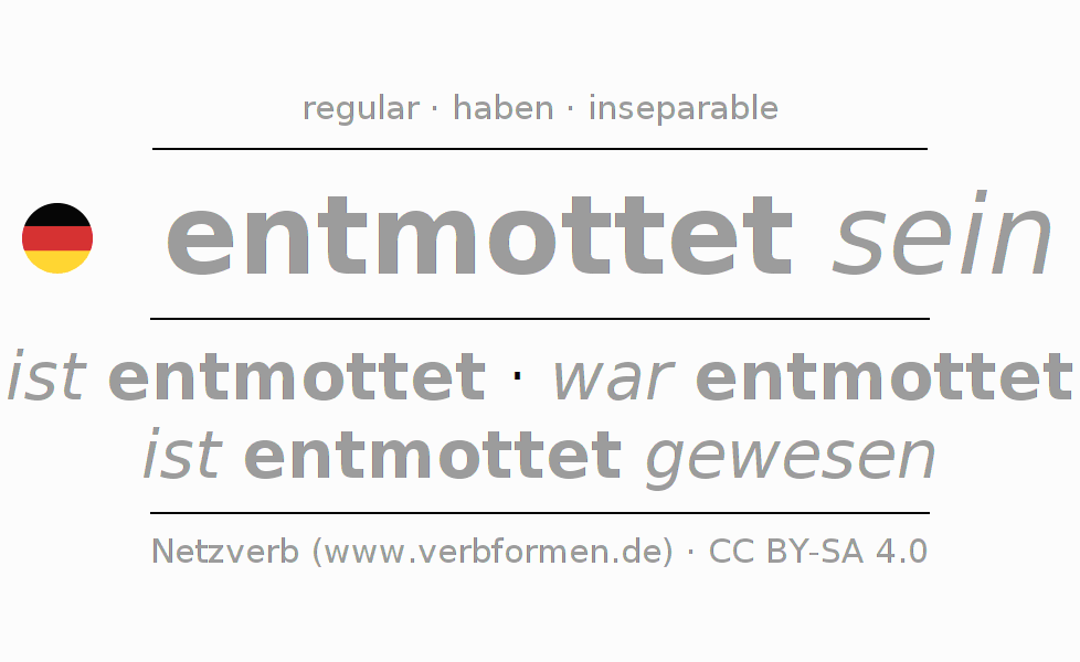 Clear online presentation of the verb 'entmottet sein' including all verb forms. Therfore, the flection of the verb entmottet sein can be useful for homework, tests, exams, German lessons in school, learning German, during studies and adult education. Especially for people learning German it is essential to know the correct flection of a verb (ist entmottet - war entmottet - ist entmottet gewesen).