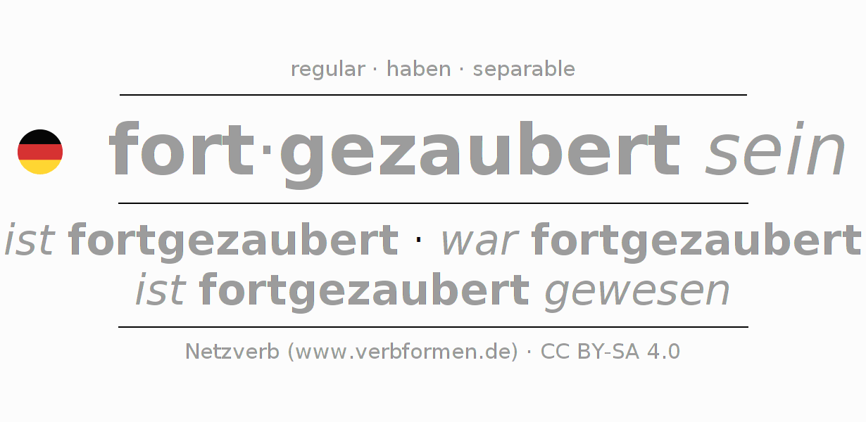 - Future: ich werde fortgezaubert sein, du wirst fortgezaubert sein, er wird fortgezaubert sein, wir werden fortgezaubert sein, ihr werdet fortgezaubert sein, sie werden fortgezaubert sein